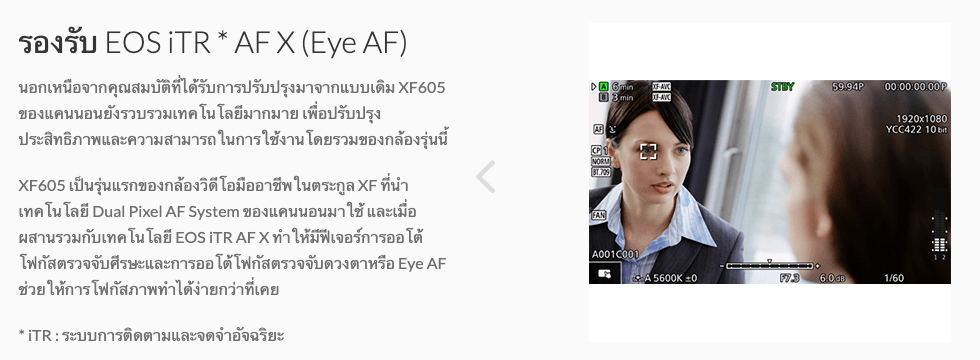 XF605 ใช้เซนเซอร์ 1.0 นิ้วที่ออกแบบมาอย่างสมดุลลงตัว ทั้งประสิทธิภาพของเซนเซอร์ ขนาดเลนส์ และคุณสมบัติต่างๆ ผสานพลังกับหน่วยประมวลภาพวิดีโอโดยเฉพาะอย่าง DIGIC DV7 ของแคนนอน ทำให้สามารถบันทึกวิดีโอคุณภาพสูงได้ที่ระดับ 4K ในพื้นที่สี 4:2:2 ที่บิตเรทสูง ทำให้มั่นใจได้ว่าจะได้ภาพคุณภาพในแบบที่งานถ่ายทอดสดต้องการ นอกจากนี้ ยังมีฟังก์ชันถ่ายภาพอินฟราเรดให้เลือกใช้อีกด้วย