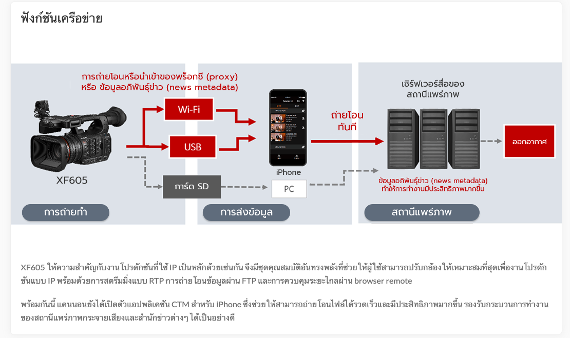 เพื่อสืบทอดความภาคภูมิใจแต่เดิมของกล้องถ่ายวิดีโอในตระกูล XF กล้อง XF605 จึงอัดแน่นไปด้วยคุณสมบัติที่ทันสมัยทั้งหมดของกล้องถ่ายวิดีโอมืออาชีพ ซึ่งรวมถึงพอร์ต XLR ขนาดเต็ม (full sized XLR port) 2 พอร์ต สำหรับเสียงระดับมืออาชีพ พร้อมกับขั้วต่อสำหรับเอาต์พุต 12G-SDI สำหรับเอาต์พุตวิดีโอ 4K Timecode Genlock และ Remote B (RS422 แบบ 8-พิน) เพื่อให้แน่ใจว่ากล้อง XF605 จะเชื่อมต่อเข้ากับโครงข่ายระบบการออกอากาศที่มีอยู่ได้อย่างสมบูรณ์ทุกระบบ