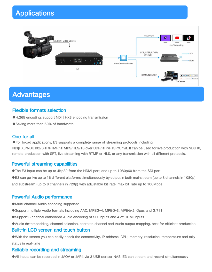 Kiloview E3 is a new generation of video encoder which with new features of video input and loop through with HDMI up to 4K P30 and 3G-SDI up to 1080 P60, encoding both HDMI and 3G-SDI video by H.265 and H.264 simultaneously or either of the sources or a mixed video from the both video sources for either live production, post production, remote transmission, live streaming or recording in different industries. It supports streaming to 16 destinations with adjustable bit-rate up to 100Mbps simultaneously.