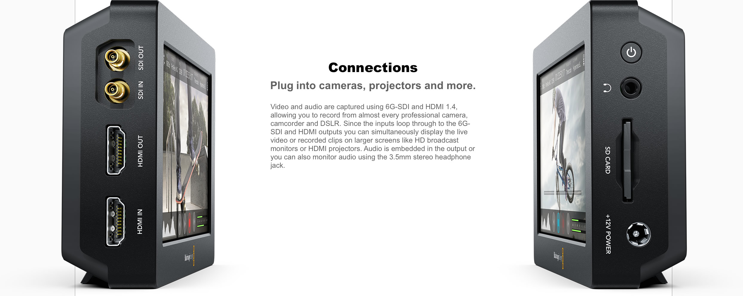 Video, Audio and Power Connections  Connect to professional cameras, camcorders and DSLR’s