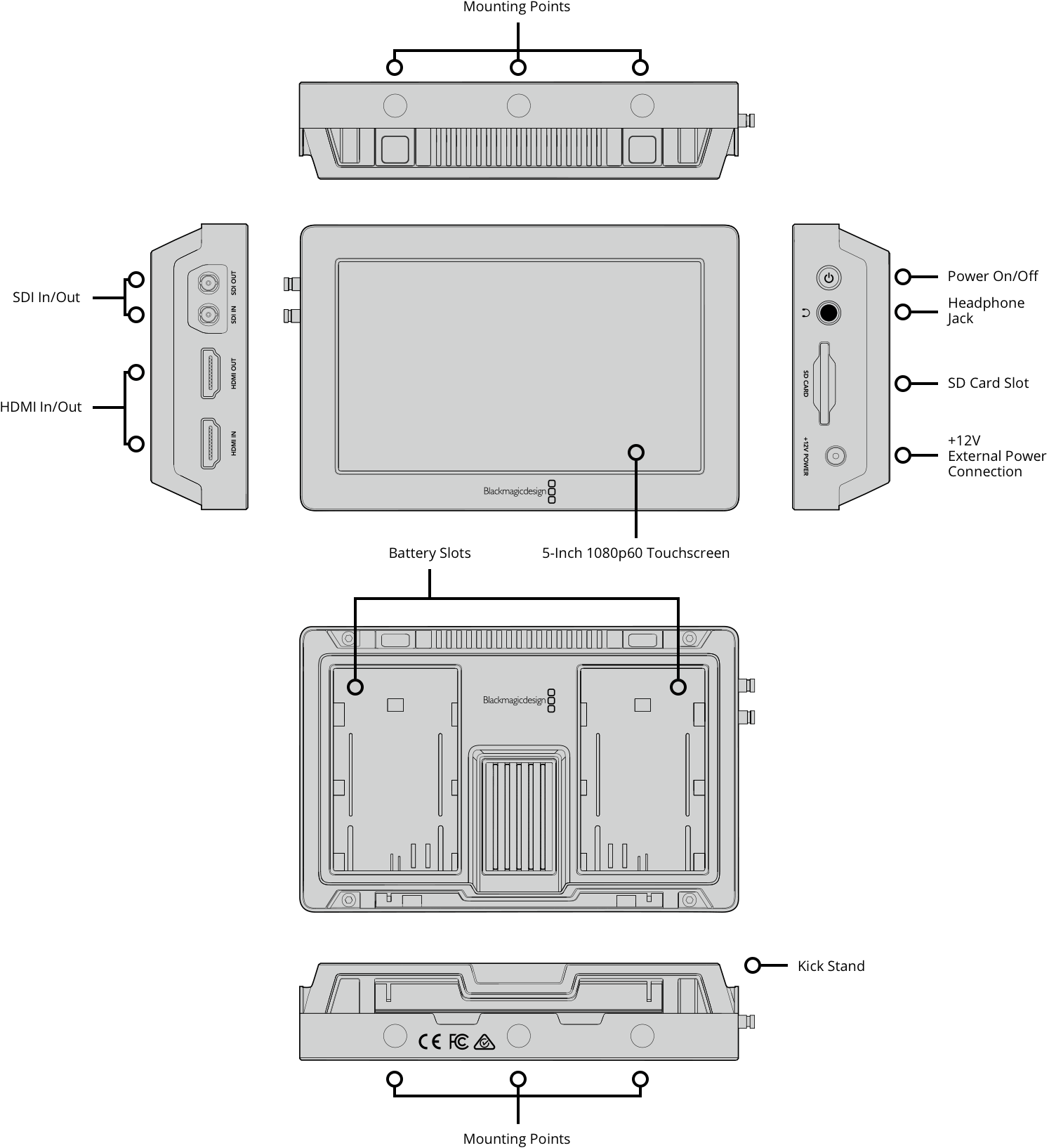 The compact design of the Blackmagic Video Assist includes HDMI and 6G-SDI inputs so you can record from virtually any video camera or DSLR. The loop through output lets you monitor on larger HD broadcast displays or HDMI projectors. Audio can be monitored from the 3.5mm stereo headphone jack and for studio shoots, the 12V universal power supply gives you continuous operation. When you’re on location the two side by side LP-E6 battery slots let you go completely mobile and give you enough power for longer shoots.