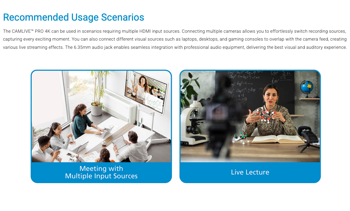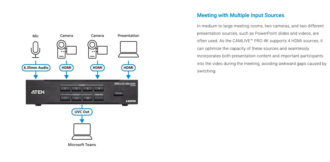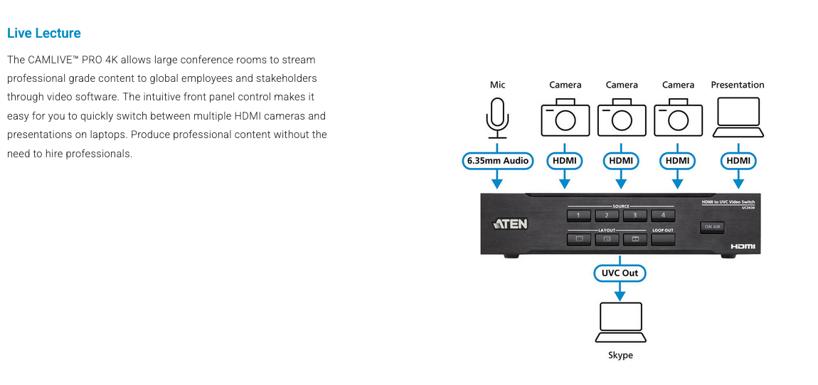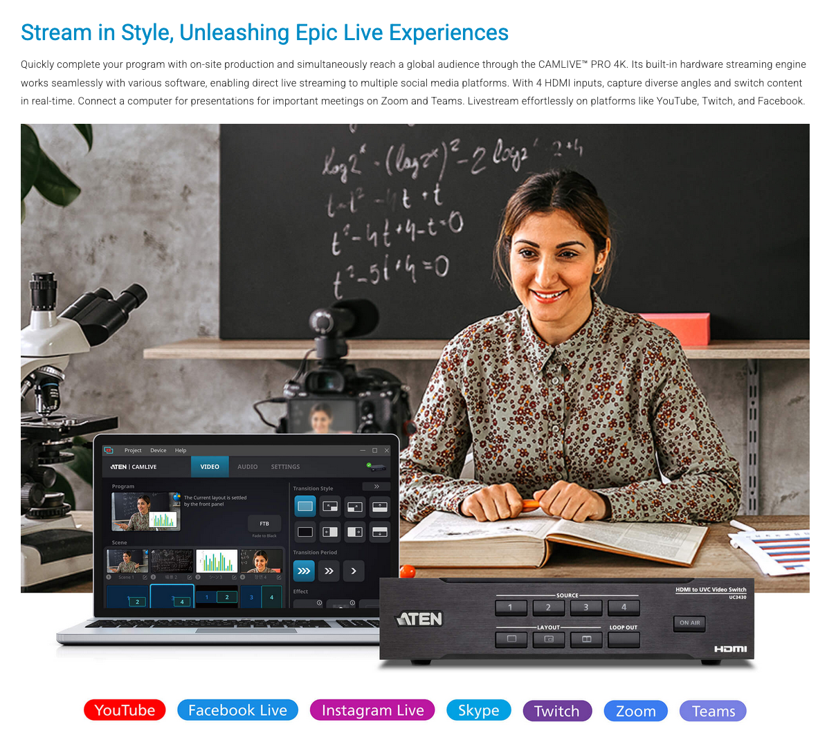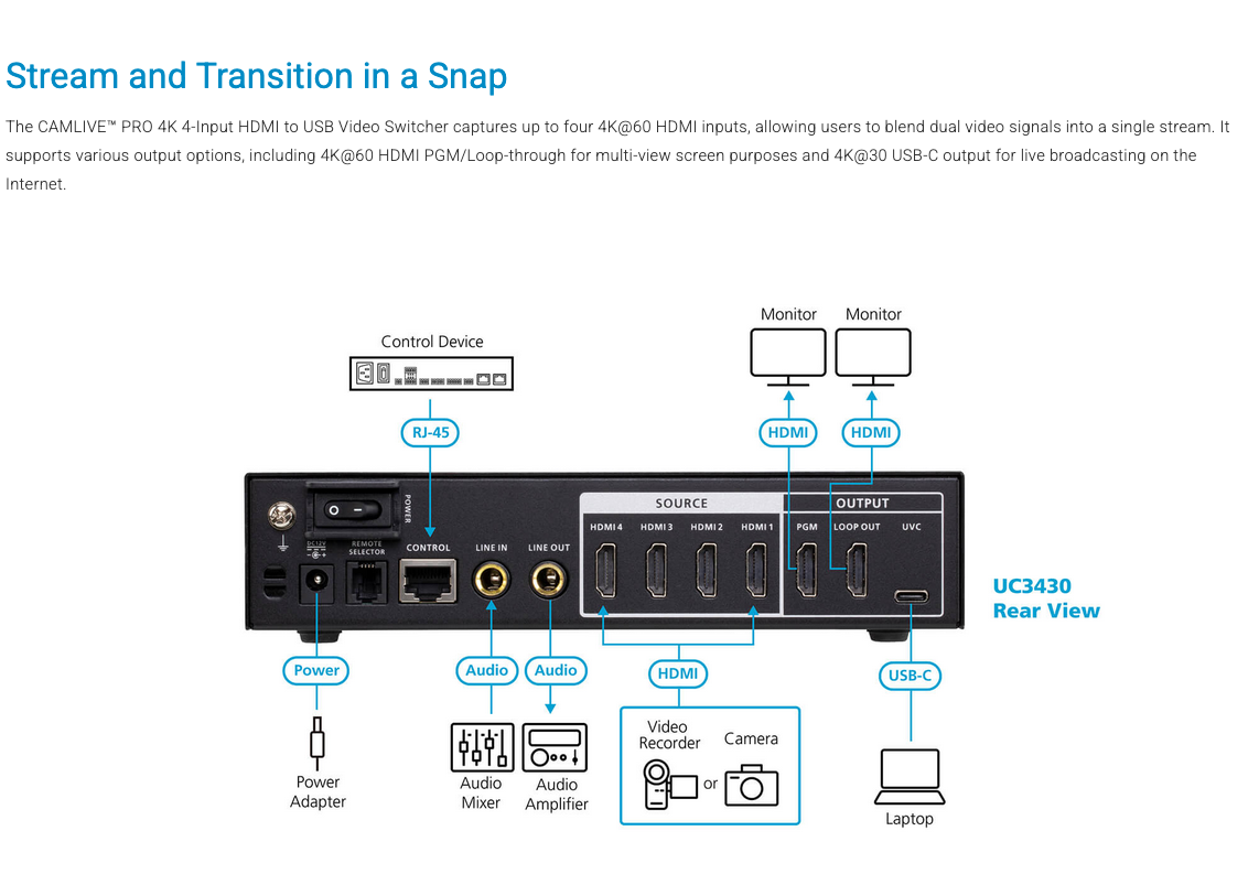 The CAMLIVE PRO 4K (UC3430) 4-Input HDMI to USB Video Switcher captures up to four 4K @ 60 HDMI inputs, enabling users to mix dual video signals into one single stream while supporting multiple output options, including 4K @ 60 HDMI PGM / Loop-through for preview and monitoring purposes and 4K @ 30 USB-C output for live broadcast on the Internet. The USB-C output supports popular streaming software including Zoom, Microsoft Teams, Youtube, Facebook, GoToWebinar, Open Broadcaster, XSplit Broadcaster, and Twitch on Windows and Mac. Plus, the CAMLIVE PRO 4K features audio mixer functionalities to mix up to 4 HDMI audios and 1 line-level audio for users to add live narration / music to the content, streamlining the production process.
