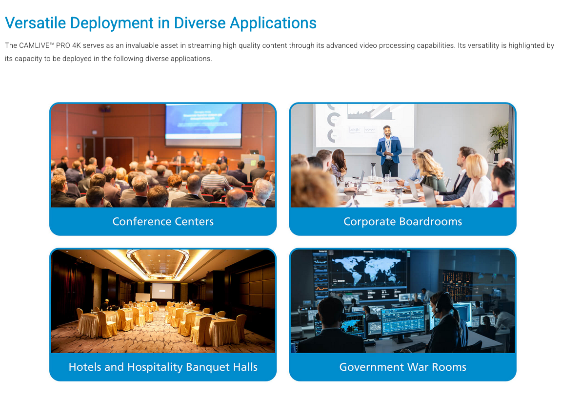 The CAMLIVE PRO 4K works with a rack mount kit (sold separately) to give installation flexibility in media cabinets or DIT stations. With the switcher’s one-stop programming and streaming functionalities that work on Windows / Mac platforms, multi-camera streaming in scenarios in need of sharp, vivid UHD quality such as multi-cam studios, corporate conferences, lecture halls, houses of worship, and live events, has never been so easy.