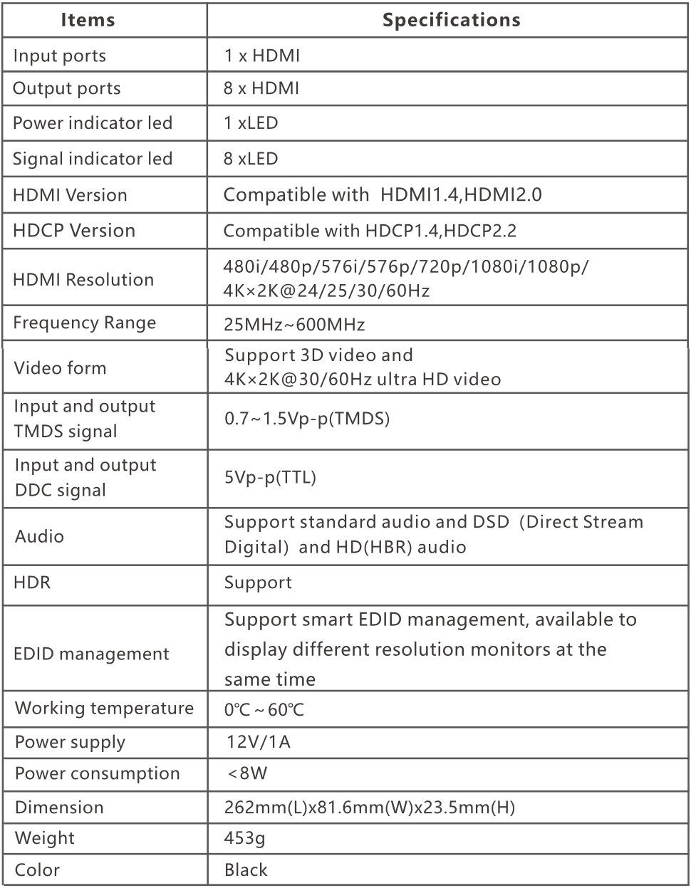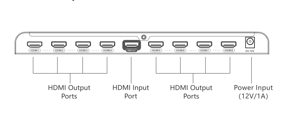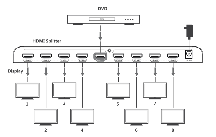 1. Distribute 1 HDMI source to 8 HDMI displays