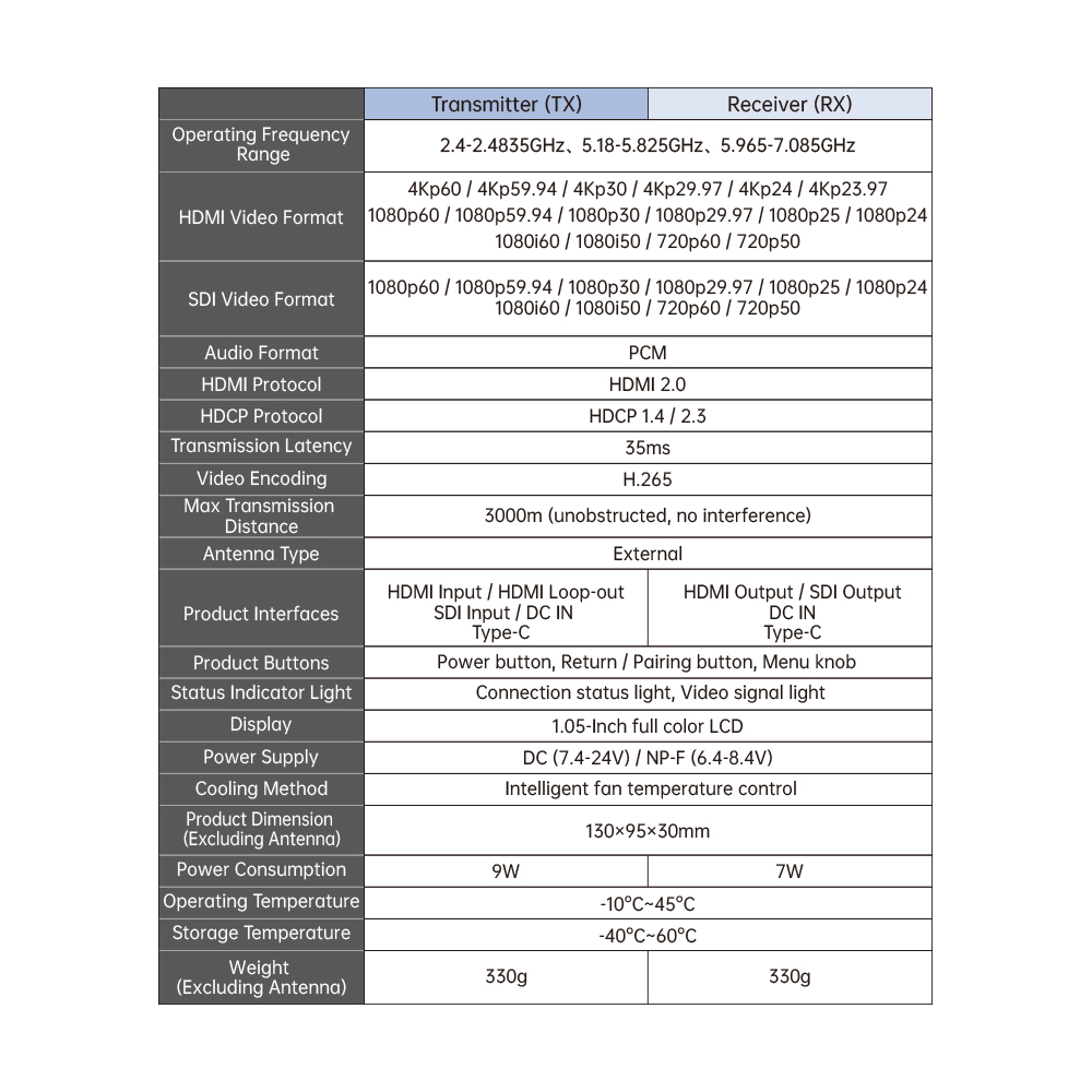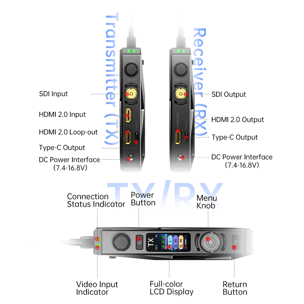 The TX supports simultaneous HDMI input and SDI input, and HDMI loop-out for real-time monitoring. The RX supports simultaneous HDMI output and SDI output, so director monitoring, DIT backup, and streaming encoding can all run at once.