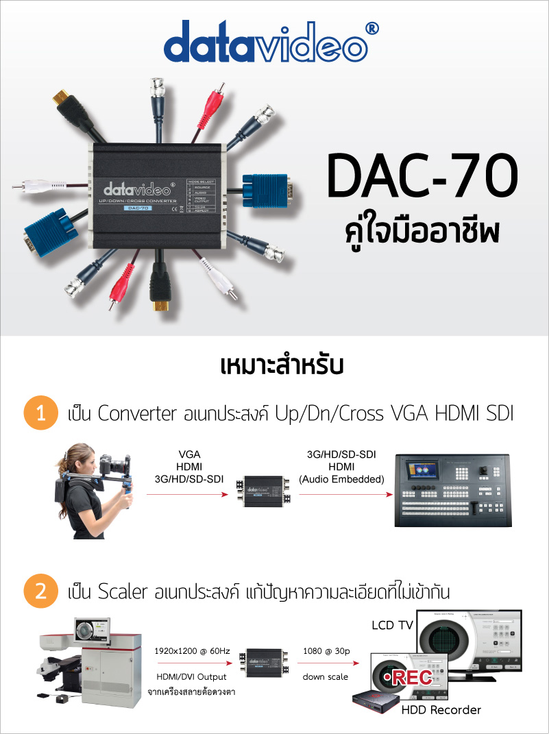 Datavideo DAC-70 เป็นอุปกรณ์แปลงสัญญาณวิดีโอ (Video Converter) และทำหน้าที่เป็น Video Scaler / UP / Down / Cross Converter ในตัว ออกแบบเพื่อรองรับสัญญาณ Input ได้หลายหลาย VGA to SDI, VGA to HDMI, HDMI to SDI, SDI to HDMI , HDMI to HDMI และ SDI to SDI ปรับเพิ่ม-ลดความละเอียดภาพได้ตั้งแต่ SD (525i) ถึง Full HD (1080P) พร้อมเสียง Audio Input (L/R) โดยสัญญาณ SDI รองรับทั้ง 3G/HD/SD-SDI มีช่องสัญญาณ SDI Loop thru output ในตัว