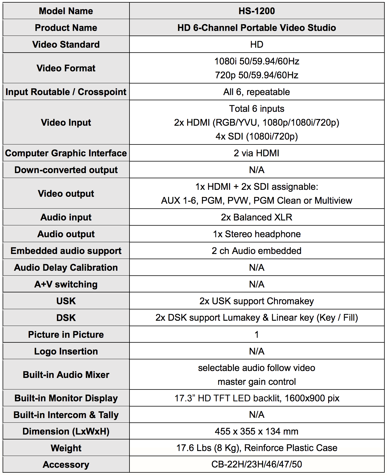 HS-1200 is a cost effective 6 channel broadcast-quality hand-carry mobile switcher, it is designed for live events and TV programs that need to mix a variety of video and audio sources. The HS-1200 is a lightweight, portable and powerful featured mobile studio solution.