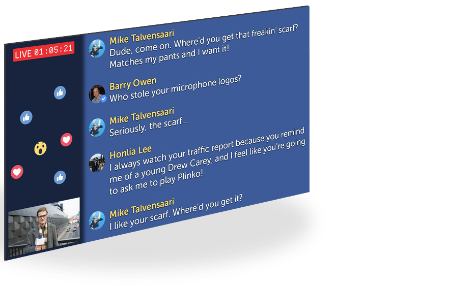 - Generate follower engagement with Talent View functionality that gives on-camera personalities the ability to see Facebook Live Reactions.