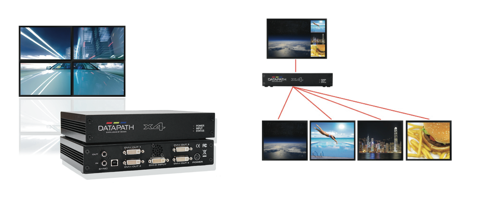 The Datapath x4 is a stand alone display wall controller that accepts a standard single or dual-link DVI input and can flexibly display this across four output monitors